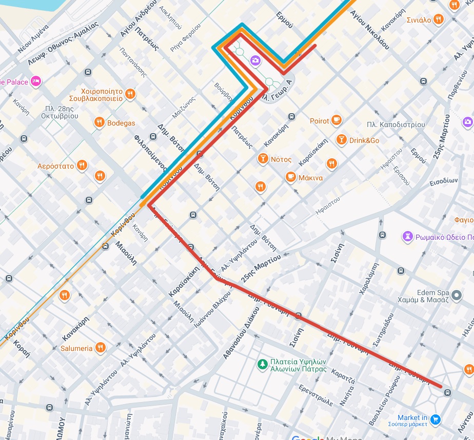 Γούναρη – Κορίνθου – Περιμετρικά Πλ. Γεωργίου (κάτω μέρος) – Κορίνθου – Ερμού – Αγ. Νικολάου